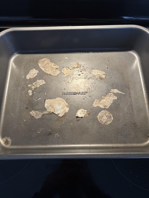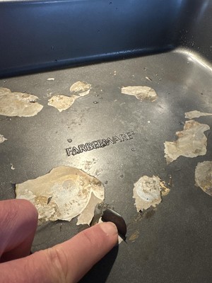 A: Thank you for reaching out with your feedback Diane and we apologize for your disappointment with your Farberware 12" x 16" Nonstick Roaster with Rack. We will certainly pass your comments along. At your earliest convenience, if you would like to discuss the issues you are experiencing, please reach out to our cookware experts at support@farberwarecookware.com. They are available online Monday through Friday from 7:30 am to 4:00 pm Pacific Time, excluding holidays. <ms>