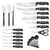 - 22-PIECE SET INCLUDES: 8 inch chef knife, 8 inch slicing knife, 5 inch Santoku, 5.5 inch utility knife, 4 inch utility knife, 3. 5 Inch paring knife, and (6) 4. 5 Inch steak knives. Also included is a pair of all purpose kitchen scissors, set of 5 plastic measuring spoons, a flat top spatula, an angled spatula and a jar spatula.