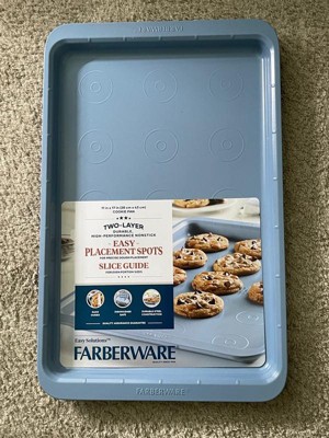 [This review was collected as part of a promotion.] I received the Farberware 11in X 17in Cookie Pan. I love it. This product is a two layer durable and high performance nonstick pan. The easy placement spots are wonderful. You get the perfect cookie every time. This product even has a slice guide and it’s dishwasher safe. Thank you for a great product. I can’t wait to bake some more cookies!