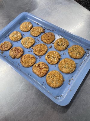 [This review was collected as part of a promotion.] I used this cookie pan tomake scratch peanut butter cookies and chocolate chip cookies. The pre-marked spaces for cookie dough are very helpful to prevent placing the dough too close together which results in the cookies cooking into each other. The are also pre-marked lines for a cutting guide for brownies so you end up with brownies all equally sized. The non-stick lining is true to the description as none of the cookies stuck to the pan. The beautiful light blue is pleasing to the eyes. I plan to purchase more pans on this line to replace my old, discolored ones.