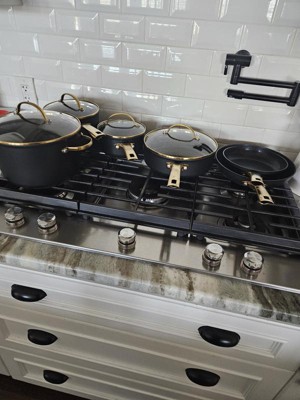 This cookware set impresses with its stylish design, featuring elegant gold accents and a nonstick surface that makes cooking and cleaning a breeze. Guests appreciate the quick heat distribution and the variety of sizes included, making it versatile for different cooking needs. While some concerns exist regarding handle heat and durability, the overall functionality and aesthetic appeal make it a delightful addition to any kitchen.
