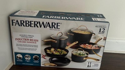 Farberware Forged Induction Ceramic Nonstick Pots and Pans Set with Lids , Suitable for All Stovetops, 12 Piece Cookware Set - Black and Gold