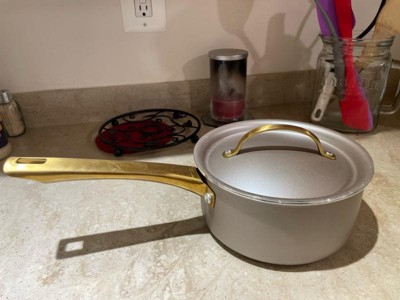[This review was collected as part of a promotion.] The Farberware Radiant 2 Qt. Saucepan is a sleek great quality saucepan. I love the silver color with the gold accent handles. It works great and is non stick which is a huge plus for me.