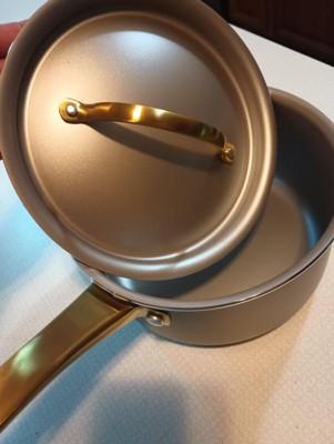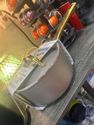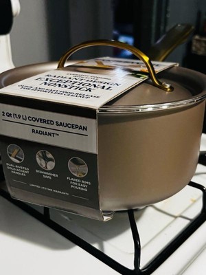 [This review was collected as part of a promotion.] The Farberware Radiant 2 Qt. Saucepan is a sleek great quality saucepan. I love the silver color with the gold accent handles. It works great and is non stick which is a huge plus for me.