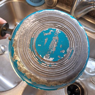 I bought this set of pots 2 years ago. Within a year the bottom of the pots and pans the paint flaked off. The sides of the pots are losing large chunks off the outside Aqua paint. We have to cook carefully so we don't ingest paint flakes. You also lose nonstick Within 6 months. See photo!!