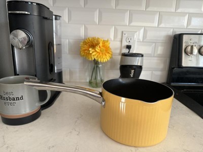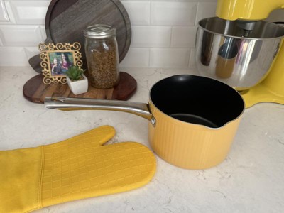 What drew me to these were 1) the Farberware reputation (my G-FIL used to work for y’all and I can’t count the times I’ve heard about the “quality of work they created”). 2) the color to match the yellow accent pops throughout my kitchen. This is now the second set of Farberware that I’ve owned. While I do like the light-weight, deep pots, both the handles on the pots and lids become too hot to handle, rather quickly. I cannot open or transport them without the safety of potholders. Unfortunately despite my choice of silicone and cotton potholders, the grip feels clumsy and I am terrified they will slip and fall when tilted to spoon out their contents or transfer them into the sink. **PLEASE KEEP YOUR CHILDREN AND PETS OUT OF THE KITCHEN TO AVOID BURNING THEM. So far (it’s been 3 weeks) the non-stick hasn’t chipped and the bottoms remain free from the black burned on grease. The utensils supplied are poor quality- worse than the dollar tree, seriously, so maybe donate them to your kids’ play kitchen on a short term basis. I now remember my previous set were a wedding registry suggestion, as a nod to my G-FIL, when we were super young and poor, but they didn’t last long and actually did cause the burn-scar on finger. We’ve had Farberware, Cuisinart (phenomenal silicone handles but their non-stick scratches with plastic utensils) Circulon ($$$ & hard to clean the grooves), and Red Cooper (ceramic-easy to clean the inside, not the bottoms). I’m no Bobby Flay so I’ll keep my pop of yellow for right now, but for the same money, you can definitely find something safer!