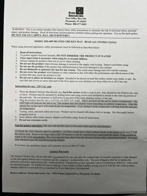 [This review was collected as part of a promotion.] This will be great for keeping my chicks warm and comfortable this winter. Very nice sturdy product that will be easy to clean. Closed construction to keep your chickens safe and also a covered and protected cord.