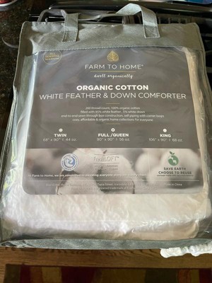 This generously filled Farm to Home organic white feather and down comforter gives you a look and feel of an all-down-filled comforter for a fraction of the cost, featuring a super soft, breathable organic cotton cover and end-to-end sewn-through box quilting to provide you the ultimate sleeping experience.