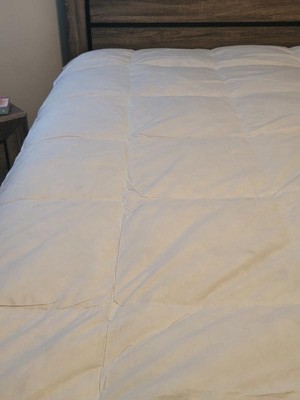 [This review was collected as part of a promotion.] This cozy down comforter seems like it would be a good weight for all seasons. The cotton cover is soft and I have yet to notice any feathers poking through after several weeks of use. I feel the full/queen is a bit narrow for a queen sized bed and prefer it be a bit wider. It would be perfect for a full sized bed.