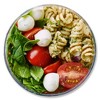 whole grain pasta, pesto (basil, canola oil, water, parmesan cheese, garlic, salt), red onion, extra virgin olive oil, canola oil, lemon juice, salt, pepper), tomatoes, mozzarella pearls, spinach