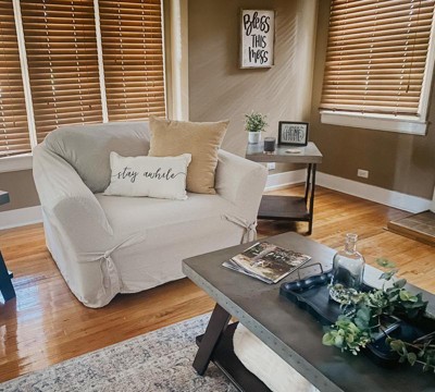 Farmhouse Basketweave Chair Slipcover Gray - Sure Fit: Adjustable Ties, Elastic Band, Fits 32"-43" Armchairs