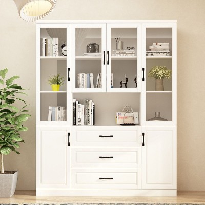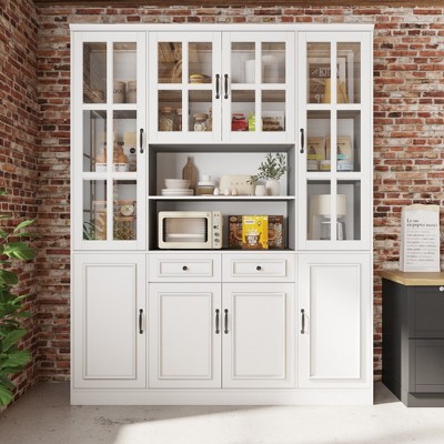Farmhouse Coffee Bar Cabinet, 72" Tall Kitchen Hutch with 2 Sliding Barn Doors, 3 Drawers, Wine & Glass Rack, Pantry Storage Cabinets, Antique White