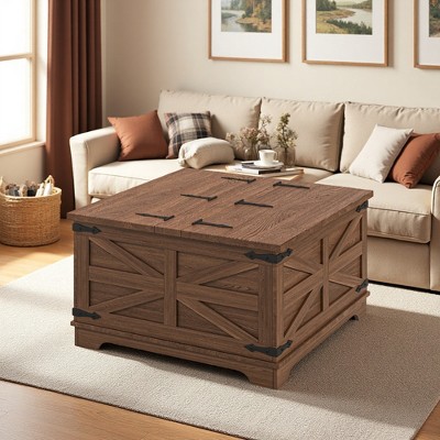 Farmhouse Coffee Table with Storage, 32" Square Wood Center Table with Dual Flip-Top Lids, Hidden Storage Compartment and Arc Base for Living Room