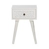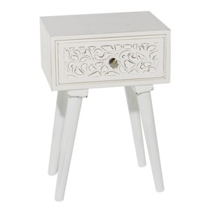 Bring a finishing touch to your home with an inviting appeal with this beautifully crafted accent table. A compact friendly table providing you with additional surface storage space any where in your home. Wood accent table are best displayed near upholstered sofa or arm chair with books and potted pot for delicate display. This item ships in 1 carton. White accent table features a single drawer. Suitable for indoor use only. This item ships fully assembled in one piece. Maximum weight limit is 100 lbs. Made in India. This is a single white colored end table. Farmhouse style.