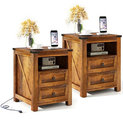 Bring rustic charm and modern convenience to your bedroom. This farmhouse nightstand features a unique barn door design and a built-in charging station with 2 AC outlets and 2 USB ports to power all your devices. Inside, an adjustable shelf offers flexible storage. Measuring 18"W x 18"D x 24"H, this sturdy table doubles as a stylish end table for your living room or guest room.