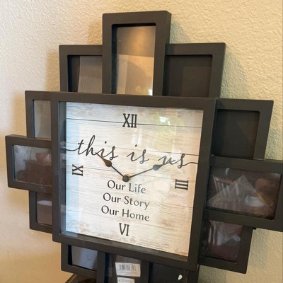 Add a warm and welcoming touch to any room with a timepiece that brings your memories to the forefront. This charming collage clock features many frames around a central quote that reads, "this is us: our life, our story, our home".