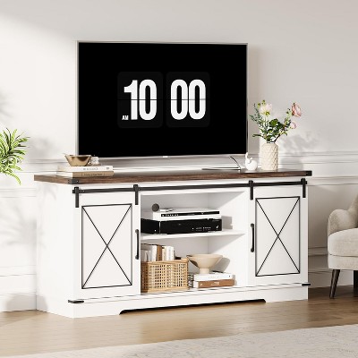 Farmhouse TV Stand up to 65 InchesElevate Your Living Space – Rustic Charm Meets Modern Functionality Highlights at a Glance:- Fits 65-Inch TVs – Perfectly sized for large-screen televisions in living rooms or bedrooms.- Rustic Farmhouse Style – Classic barn doors and distressed wood finish for authentic charm.- Smooth Sliding Barn Doors – Quiet, effortless access on durable steel tracks.- 3 Adjustable Shelves – Customizable storage for DVDs, consoles, and decor.- Hidden & Open Storage – Combines concealed cabinets + open shelves for versatility.- Easy Assembly – Numbered parts + clear instructions (2-person recommended).- Multifunctional Design – Functions as TV stand, media console, and storage cabinet. Specification:Material: PBProduct Size: 59''L x 16''W x 28''HTabletop Max. Capacity: 500 LbsAdjustable Shelf Max. Capacity: 30 LbsBottom Max. Capacity: 150 Lbs Packing List:1x Farmhouse TV Stand1x Hardware Pack1x User Manual Friendly Note:1. Please follow the installation instructions step by step. Before starting, make sure you have all the parts you need.2. Wipe down both the interior and exterior surfaces with a damp cloth regularly to remove dust and spills, preventing any buildup of dirt or stains.