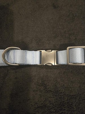 This is such a sharp looking dog collar. Length is adjustable and easy to adjust. The color is like a steal blue and looks so great against my dogs white fur. The metal quick release clasp feels strong and gives it an upscale look.