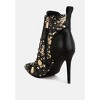 With a sleek lace-up front and striking stiletto heel, these faux leather boots are a bold choice. Featuring an abstract splash pattern, pointed toes, and cushioned insoles, they combine style and comfort. The 4-inch heel and pull tabs complete this bold pair of ankle boots. Type: Boots Upper Material: Faux Leather Outer Sole: TPR Closed Pointed Toe Abstract Splash Pattern Lace-Up Detail Stiletto Heel Pull Tabs Plush Cushion Insoles Heel Height: 4 inches SH5216