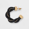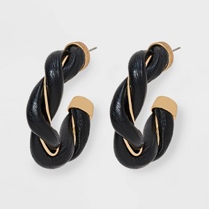 A: The earrings feature an open-hoop design wrapped in twisted faux leather for a unique look.