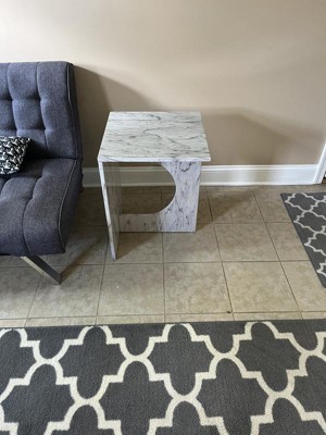 This Faux Marble Accent Table from Threshold™ brings modern style to your living space. Made from white faux marble with a black pattern, it showcases an inverted L-shape and a C cutout base for a unique look. Place this accent table next to a sofa in your living room or between two chairs to hold a cup of coffee, a flower vase and your latest read, or use it as an end table anywhere in your home.