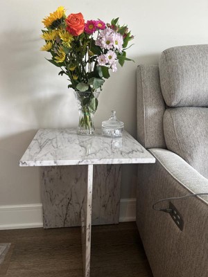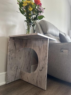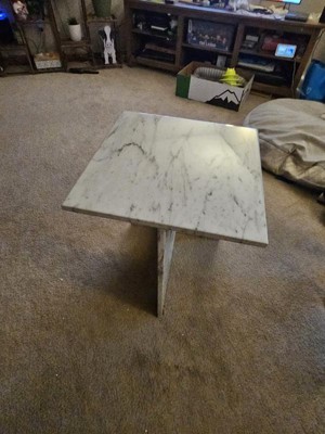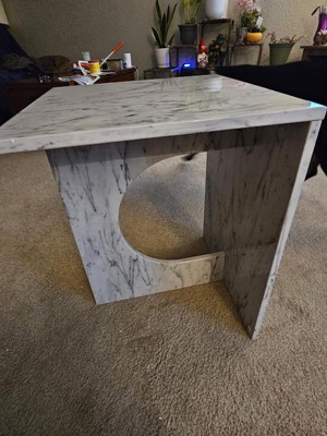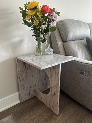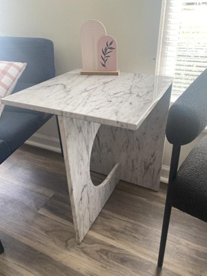 This side table is unique and absolutely beautiful. I love the modern design and the marble pattern. It is neutral and fits perfectly in my home! I already have gotten several compliments on it from guests!