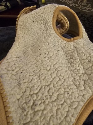 • A: Hello mag - We appreciate your interest in this item. The Faux Shearling Dog Vest by Boots & Barkley™ has a zipper which Tan colored. Happy shopping at Target. – Alvin