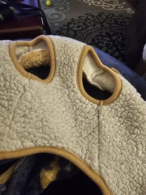 I grabbed one in the store to see if it would fit my English bulldogs in the neck in a large. I quickly got online and grabbed another. This is great for them in the winter. So now they match like usual and so nice for only 10 bucks