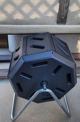 Reduce and reuse with this compost tumbler's impressive of composting space. Turn this simple composting solution 5 to 6 times every 2 to 3 days to break down the contents. The ergonomic, deep fin handholds make this composter easy to rotate so you don't have to mix your compost by hand. The tough powder-painted steel frame resists rust and will withstand years of outdoor use.
