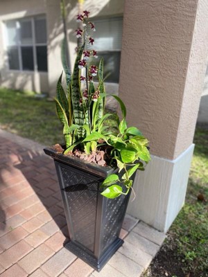 [This review was collected as part of a promotion.] Perfect addition to my patio. Sturdy and versatile. You can have a large pit or a small pit as there is an insert to specify the height of a plant. The self watering system will help with the life of the plant you select. Design on planters matches perfectly with my patio decor. A must buy.