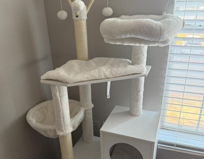 Why Choose This 2-in-1 Multifunctional Cat Tree? - One for everything: Play, snooze, scratch, answer nature3? call...you cats can spend the whole day here. - Cloud-nine comfort: Made of 500 g/m? plush, the perch, basket, and cushions are fluffy and soft, offering luxurious comfort. Safe and secure: With an anti-tip kit, you can attach it to the wall to keep everyone safe. - Easy cleaning: The cushions are removable and washable, and the veneered surface is easy to clean. - Saves you space: The 2-in-1 design is friendly to small spaces. - Keeps your home clean: The litter box cabinet hides the eyesore and reduces the smell as well as litter tracking. Specifications: - Color: Cloud White - Material: Particleboard, 500 g/m? Plush, Sisal - Product Size: 22.6"L x 19.7"W x 55.1"H (57.5 x 50 x 140 cm) - Product Weight: 40.6 lb (18.4 kg) Package Contents: - 1 x 2-in-1 Cat Tree - 1 x Accessory Kit - 1 x Anti-Tip Kit - 1 x Instructions Feandrea Notes: - Always mount the cat tree to the wall with the included anti-tip kit for safe use.