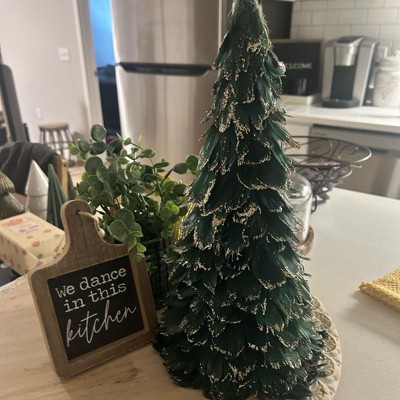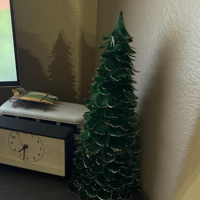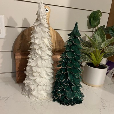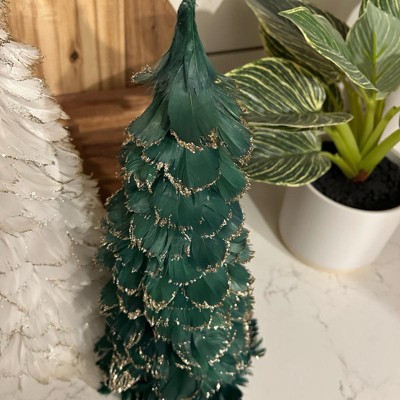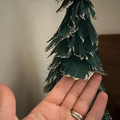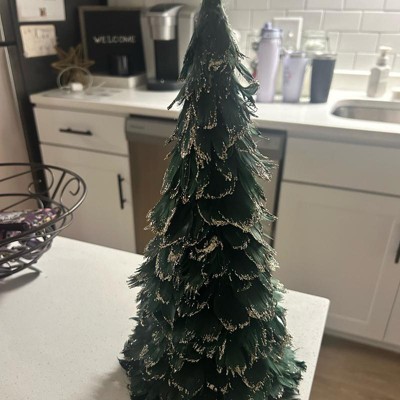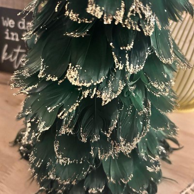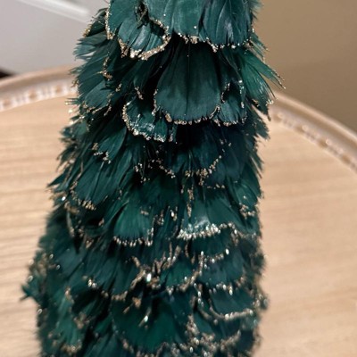[This review was collected as part of a promotion.] This green feathered tree is absolutely adorable. It features glitter at the end of the feathers which is such a fun touch! This is a medium sized tree and it is super lightweight. I paired this tree next to the larger white version to add some holiday cheer in our basement bar area. It would also be great on a shelf, in your living room, or even your bathroom. Love the stylish look this gives!