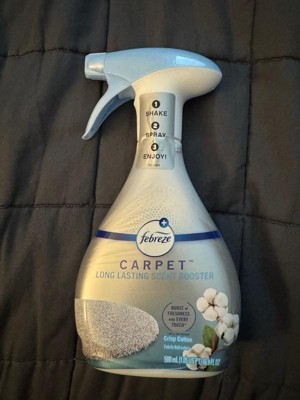 [This review was collected as part of a promotion.] Febreze Fabric Spray Carpet Scent Booster, works great. I feel like it should be a whole room freshener because this leaves the room smelling amazing! Super easy to use: gently shake to activate the product, spray, let dry & boom, you're done. I normally don't care for Crisp Cotton smell, but this scent & formula is something different. Smells great.
