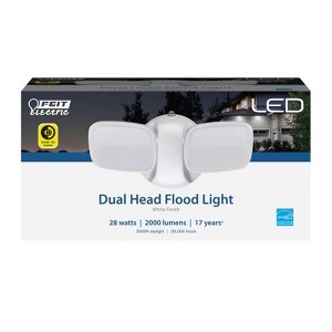 Feit Electric Dusk to Dawn Dual Head Security Lights provide all the advantages of the latest LED technology along with timeless style, allowing you to keep areas well-lit without compromising home aesthetics. A smart low maintenance solution, LED lighting saves up to 80% in energy costs over conventional light fixtures and lasts decades. A built-in sensor automatically turns lights on at night and off during the day, providing a convenient way to save on energy costs. Super bright, long-lasting LEDs are integrated into the fixture so there are no bulbs to replace. S9DFL/850/DD/WH outdoor security lights are weather & rust resistant and can be easily wall mounted and deliver welcoming, safe and reliable exterior lighting. They are rated to last up to 50,000 hours/17 years, with an estimated annual energy cost of only $3.37. Choose dependable Feit Electric security lighting for all your residential or commercial lighting needs.