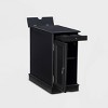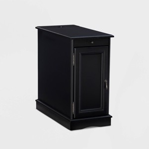 You’ll get a charge out of this deep Black end table with its flip open rear compartment housing USB and electrical changing. Sturdy and sized to fit just about anywhere at 12” wide, it’s deep enough at 24” to provide ample top space to hold anything from a lamp to gaming controls to a book, AND a pull-out tray with coasters creates more space for drinks or a snack plate. Closed storage behind the cabinet door is split by a single shelf. Also check out the bonus storage space in the back.
