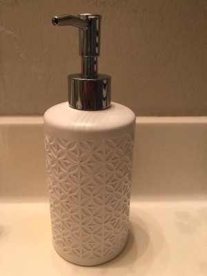 - Ceramic Lotion Pump in white features a textural embossed circular diamond motif in a distressed finish