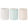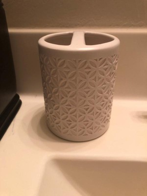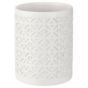 Update your bathroom decor with the Felix White Tumbler from Allure Home Creation. This beautiful white tumbler is made from durable sandblasted ceramic with a distressed finish and features an intricate allover embossed diamond motif that adds a stylish spa-like touch to your bathroom. Featuring a simple cylindrical shape, this multi purpose ceramic tumbler is on your sink for you to take a drink of water after brushing, store your toothbrushes or toothpaste or hold personal items or trinkets, adding functionality and simple flair to your space. Use alone or coordinate with other matching pieces in the Felix White Bath Accessory Collection. Also available in aqua blue and blush pink. Hand wash.