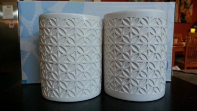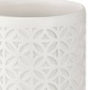 - Ceramic Tumbler in white features a textural embossed circular diamond motif in a distressed finish