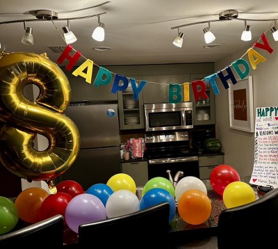 Love this birthday banner! It was easy to pack up to celebrate my son’s bday on vacation! It folds up easily. Also easy to hang with the hooks at the end of the ropes. Great colors for boys, girls or adults! Love that I can reuse for many bdays to come