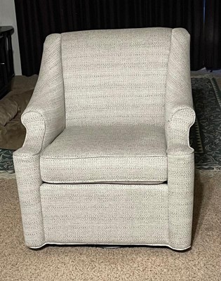 Update your living room decor with simple style and comfort of the Felton Swivel Glider Chair. Upholstered in tonal jacquard fabric with subtle hues, this swivel chair features round arms and tight back for a chic transitional look. The swivel glider base allows the chair to rotate 360 degrees and rock back and forth, while the removable cushion provides exceptional comfort. Incorporate this swivel glider chair into your living room to add style and comfort to your home decor.