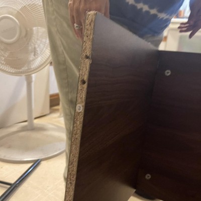 I'm working to assemble the cabinet haowever the pre-drilled screw holes for the base are too large 9Really it's almost like they mistakenly drilled for two dowel holes instead of a screw and dowel combo described in the directions. Of course I had to move around everything in my office to even put it together and now I'm either left with a cabinet that may fall apart or dealing with a mess of my office until a replacement can be sent. Needless to say it's not a small cabinet either so where to put everything in the meantime. Very unhappy... In addition each of the side pieces came with scraped up bottoms just out of the box.