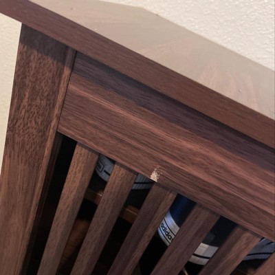 Hands down, cheapest thing ever. I tried to add photos but they're "above some G". Slats on the front be d like a metal ruler for lack of better description. The back panel is literally three pieces that come taped together for you to nail to the back. Legs are hollow plastic you screw on with tiny little screws. I didn't expect solid wood goodness but I am 46 years old and this is honestly the worst thing I have ever bought. I would return but that hassle isn't worth my time. Epically disappointed Target.