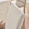 This set of two fabric dining chairs brings comfort and timeless style to any dining room. Upholstered in high-quality, soft fabric, these chairs provide a plush seating experience while adding a touch of sophistication. The neutral fabric color blends seamlessly with various decor styles, making it perfect for both casual and formal dining settings. Built with a solid wood frame, these chairs offer excellent support and stability for everyday use. The subtle wood grain finish on the legs adds a rustic yet modern touch, enhancing the overall appeal. These chairs are easy to assemble and ideal for those looking to elevate their dining area with a blend of comfort and aesthetics. Details: