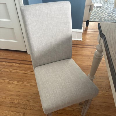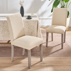 This set of two fabric dining chairs brings comfort and timeless style to any dining room. Upholstered in high-quality, soft fabric, these chairs provide a plush seating experience while adding a touch of sophistication. The neutral fabric color blends seamlessly with various decor styles, making it perfect for both casual and formal dining settings. Built with a solid wood frame, these chairs offer excellent support and stability for everyday use. The subtle wood grain finish on the legs adds a rustic yet modern touch, enhancing the overall appeal. These chairs are easy to assemble and ideal for those looking to elevate their dining area with a blend of comfort and aesthetics. Details: