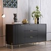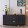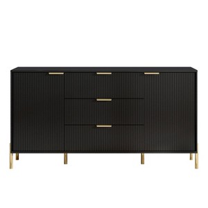 Presenting a cabinet with a modern design that showcases refined metallic textures through its unique faceted surfaces. Each carefully crafted metal handle and leg harmonizes seamlessly with the overall color scheme of the cabinet, offering options such as classic black and white, trendy black and gold, and deep navy paired with rose gold, creating a distinctive appearance that enhances the overall visual impact. The metallic finish not only conveys a sense of sophistication but also effectively repels moisture, ensuring the protection of stored items from the effects of dampness. Featuring 3-large drawers and 2-cabinets with doors, each thoughtfully designed to provide ample storage space. The adjustable shelves inside the cabinet cater to the intelligent organization of items in various sizes. This cabinet perfectly aligns with the pursuit of a high-quality lifestyle in the contemporary era. Crafted from high-quality MDF wood, it guarantees both the tactile quality and durability of the product. Rigorous anti-tipping tests ensure the reliability and safety of the cabinet, especially for households with young children. The assembly process is convenient, accompanied by a comprehensive installation guide and tools, facilitating the creation of a refined home space with ease. This cabinet is not just a practical home storage tool but also a perfect symbol of taste and a high-quality lifestyle.