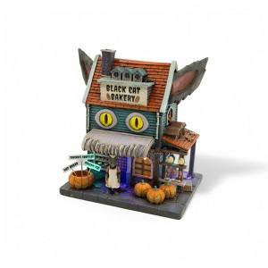 Treat your Halloween village to a dash of spooky sweetness with the Black Cat Bakery. This cat-themed shop features glowing yellow eyes, playful ears on the rooftop, and a friendly feline baker serving up festive pastries. Pumpkins and whimsical décor add warmth and charm, while LED lights bring the scene to life with a magical nighttime glow. Whether you're building a full village or adding a standout piece, this bakery blends mischief and coziness into one irresistible Halloween treat.
