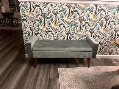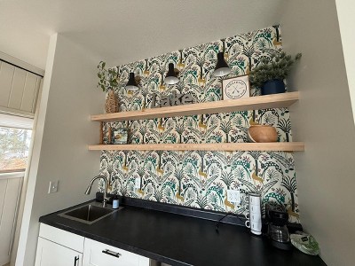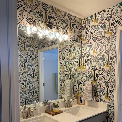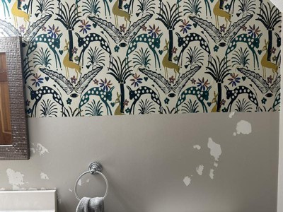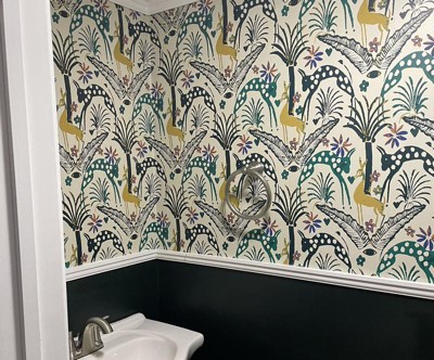 A: The wallpaper features a vibrant jungle-inspired print with woodland animals, florals, and foliage.