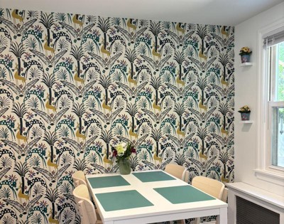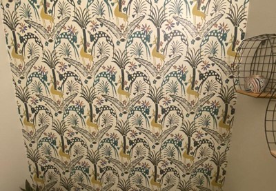 A: Hi Roomservice - Great question! This Beautiful Fiesta Animals Peel and Stick Wallpaper Is Decorated With A Vibrant Print Of Woodland Animals, Florals And Foliage Over A Cream Background. Have a wonderful day! - Shakita