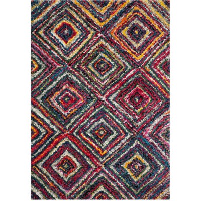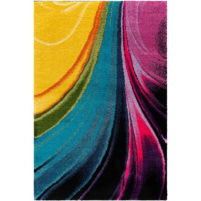The rug's radiant multi-colored design features an intricate pattern brimming with vibrant swirls and whimsical shapes that come alive with rich hues, creating a focal point that promises to elevate the aesthetics of any room.