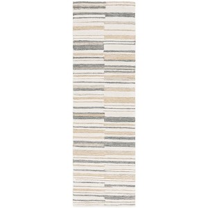 The rug features a dynamic striated pattern, offering an infusion of texture and depth to any space it occupies. The interplay of varying shades of ivory, beige, and understated grays form an abstract landscape of linearity that is both sophisticated and understated.